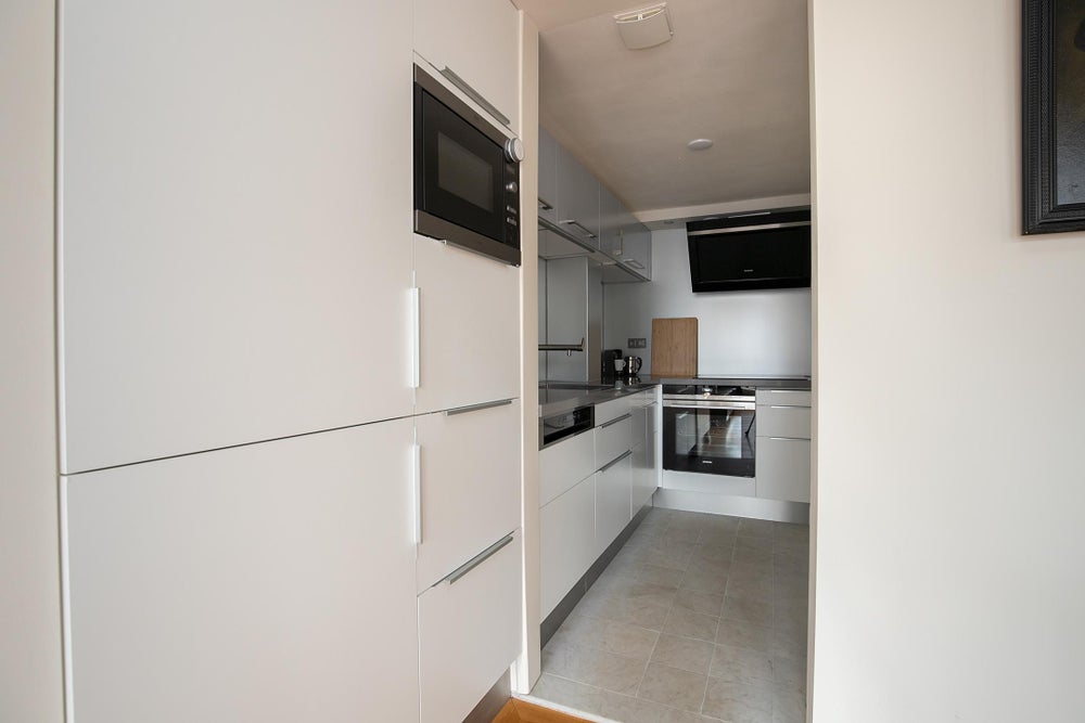 De woonkamer is een ware eyecatcher, met overvloedig daglicht dat de ruimte binnenstroomt dankzij 4 grote ramen die uitkijken op de schilderachtige gracht. De open keuken is een naadloos geïntegreerd onderdeel van de woonruimte en is voorzien van moderne inbouwapparatuur, wat het ideaal maakt voor het bereiden van maaltijden en onderhouden van gasten. De visgraatvloer voegt een vleugje elegantie toe aan de algehele esthetiek van het appartement.