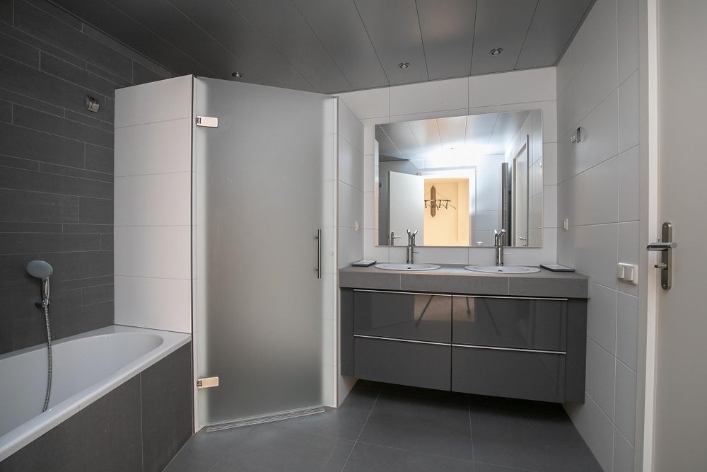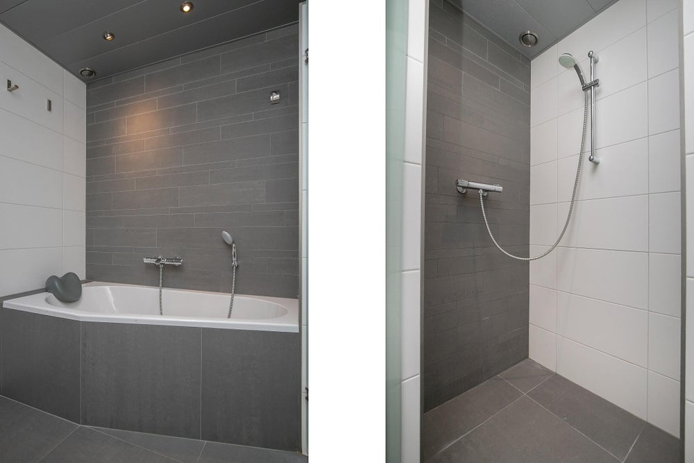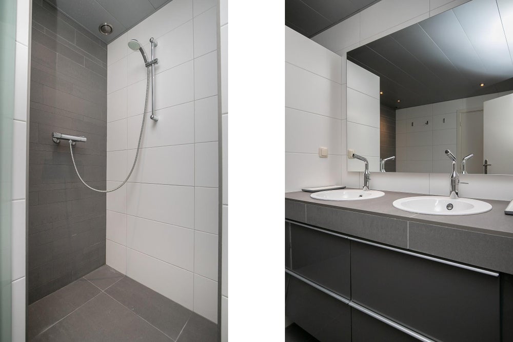 douchecabine en een dubbele wastafel, waardoor het een ontspannende en luxueuze ruimte is. Er is ook een extra wasruimte/bergruimte voor meer gemak.