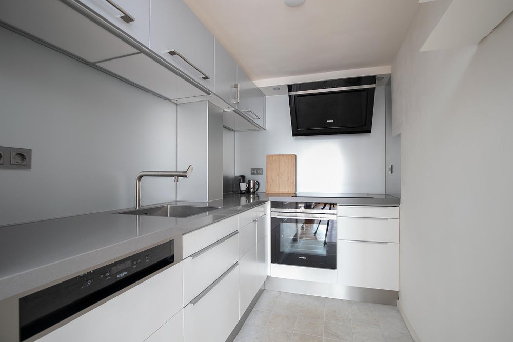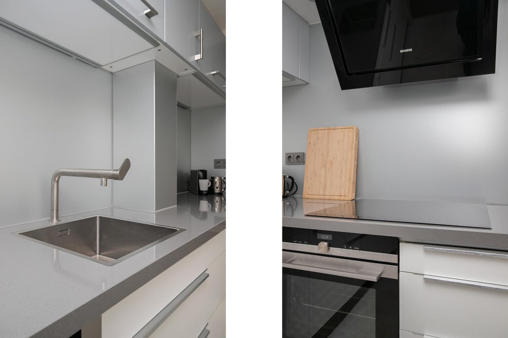 The living room is a true eye-catcher, with abundant natural light flooding the space thanks to four large windows overlooking the picturesque canal. The open-plan kitchen is seamlessly integrated into the living space and is equipped with modern appliances, making it ideal for preparing meals and entertaining guests. The herringbone floor adds a touch of elegance to the overall aesthetic of the apartment.