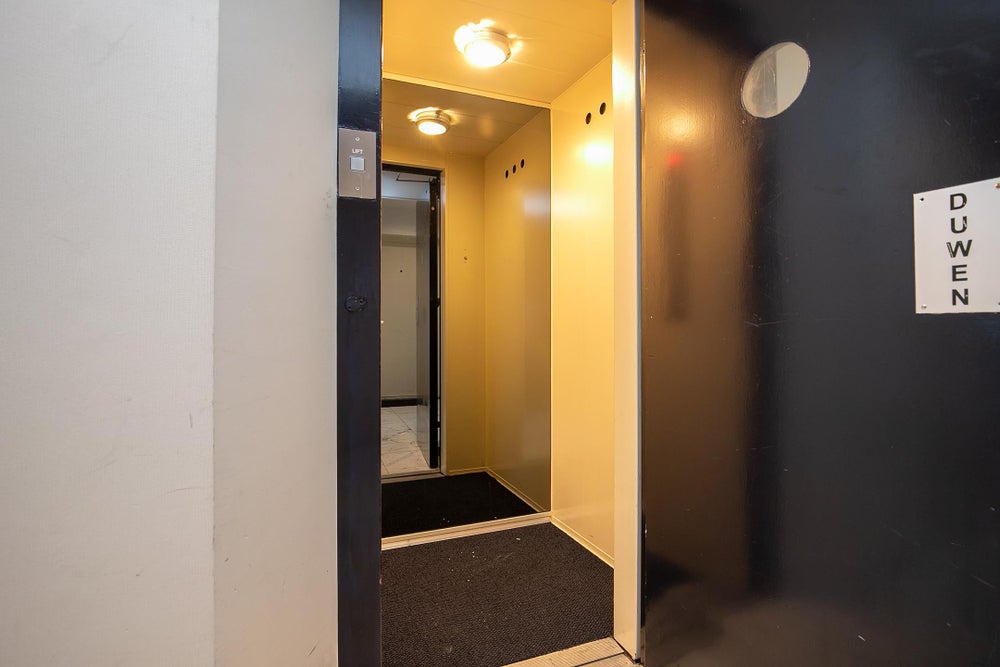 Upon entering, you are greeted by a spacious communal entrance, complete with an elevator, indoor bicycle storage, and a staircase for easy access to the apartment on the first floor. A spacious hallway leads to the living room, bathroom, and toilet.