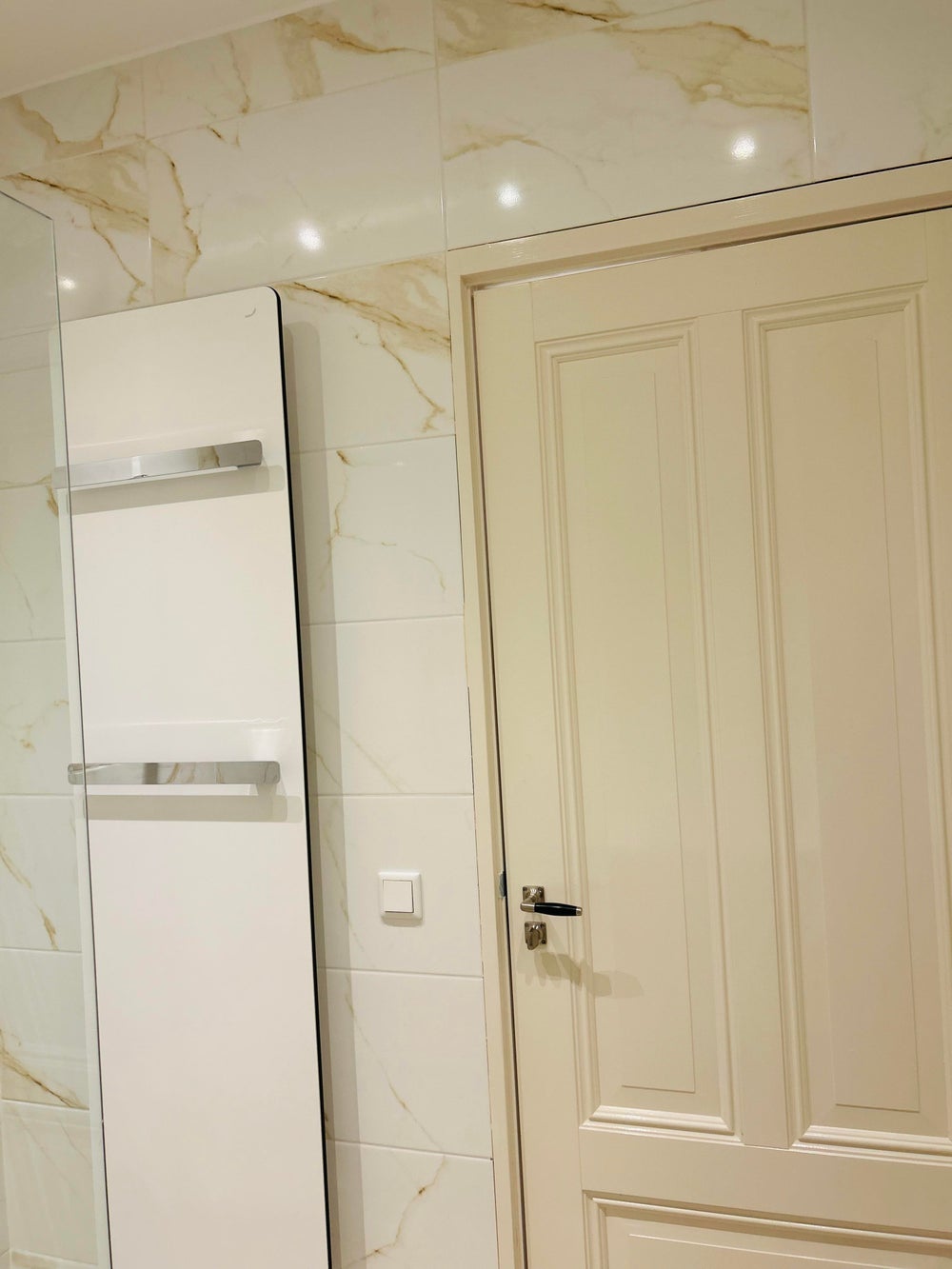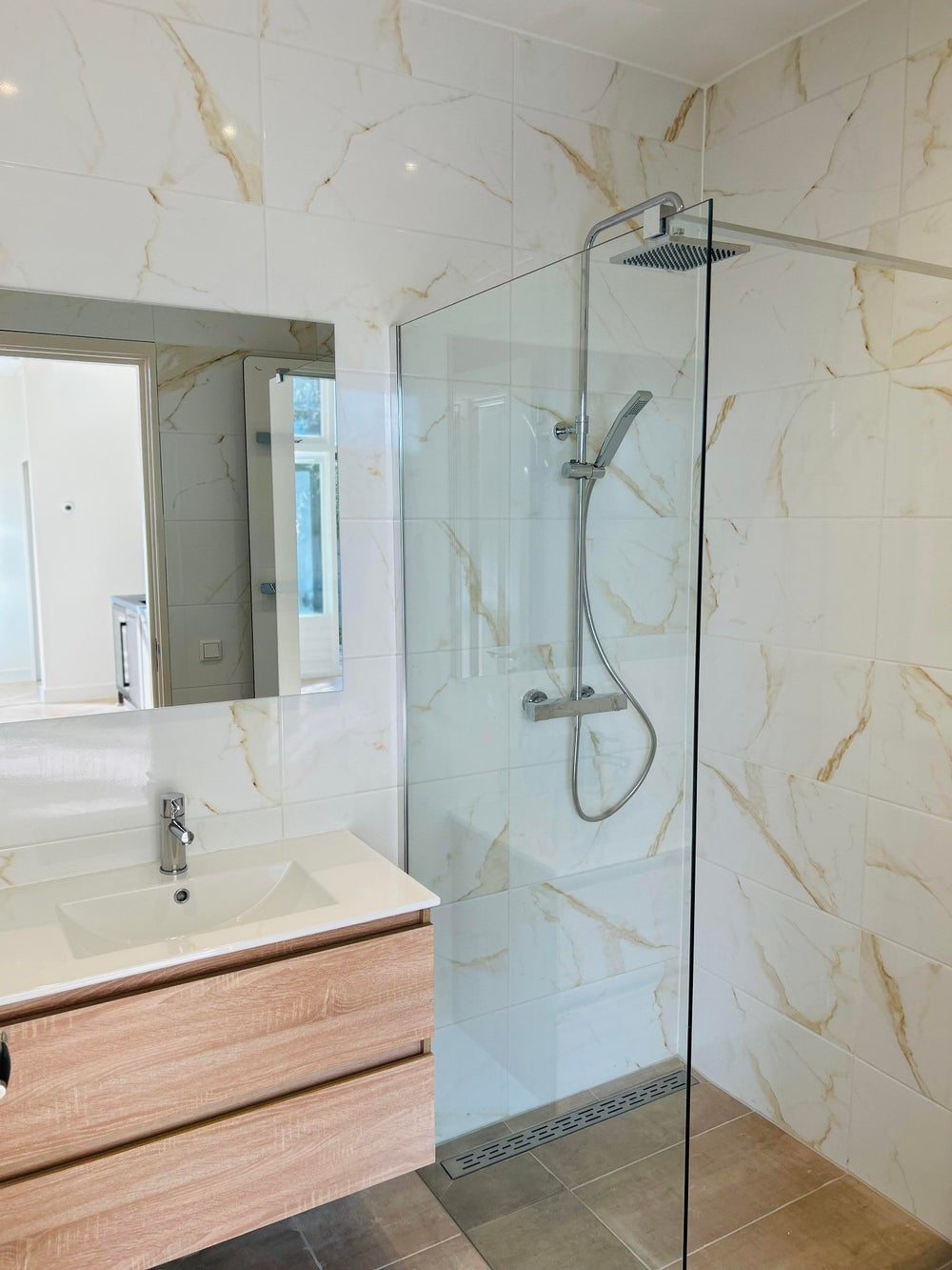 De badkamer is eveneens toegankelijk vanuit de woonkamer en is uitgerust met een wastafel, inloopdouche en een radiator met handdoekophanging.