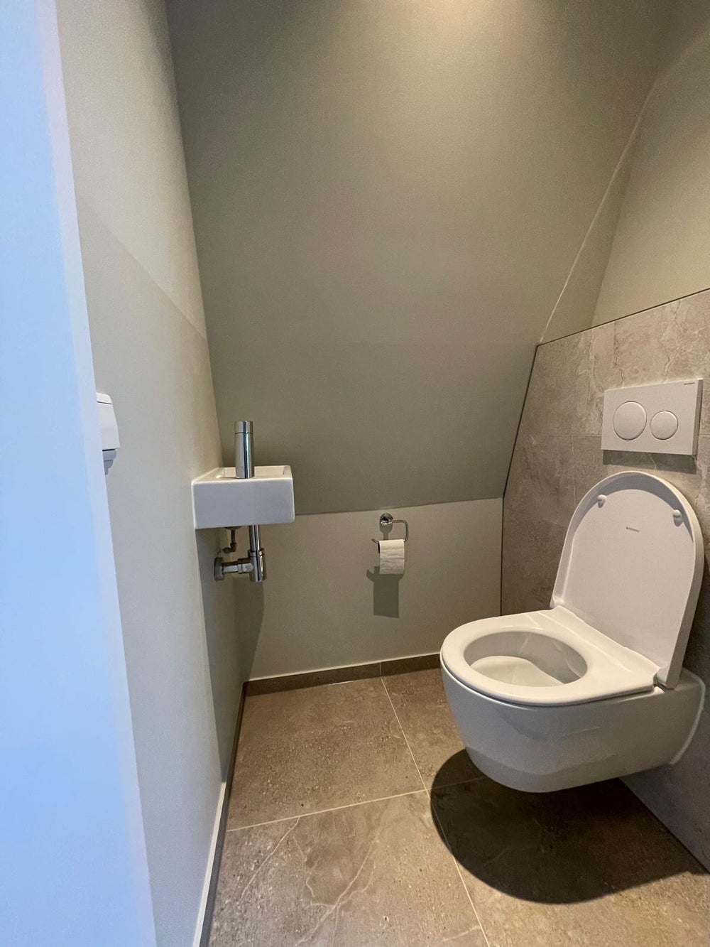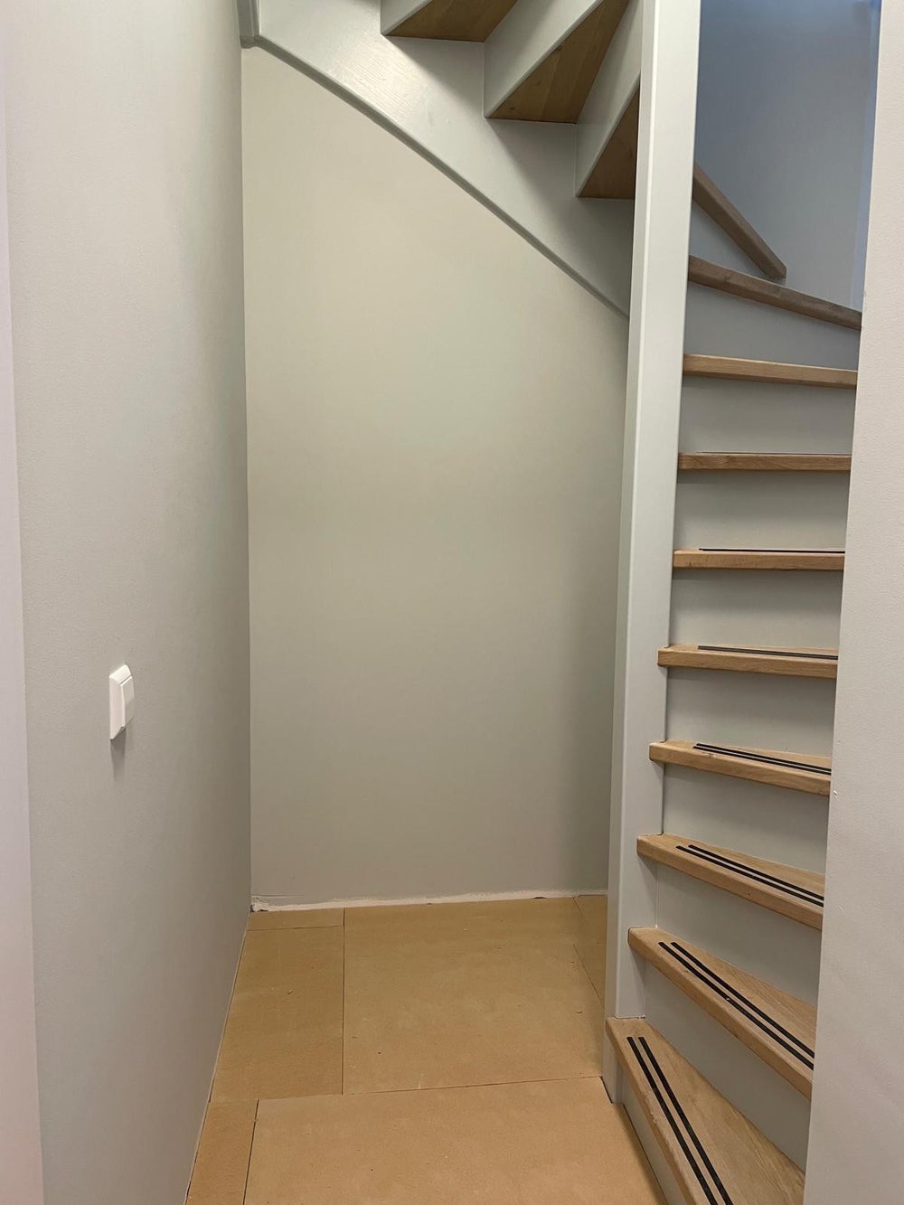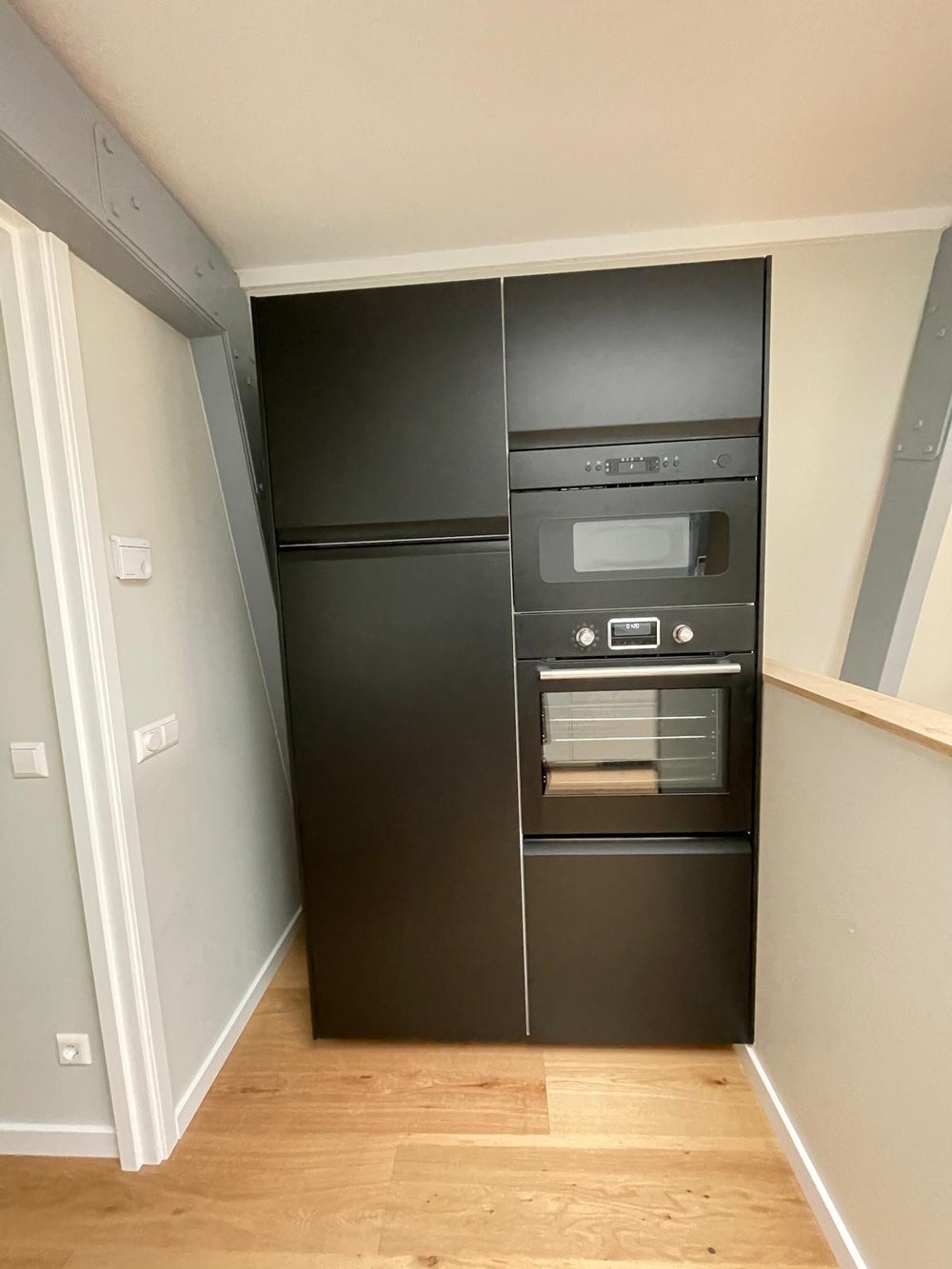 You enter the apartment from the landing on the second floor. Immediately after the front door, there is ample space for a coat rack, shoe storage, and additional storage such as suitcases. A private staircase then leads to the living room on the third floor.