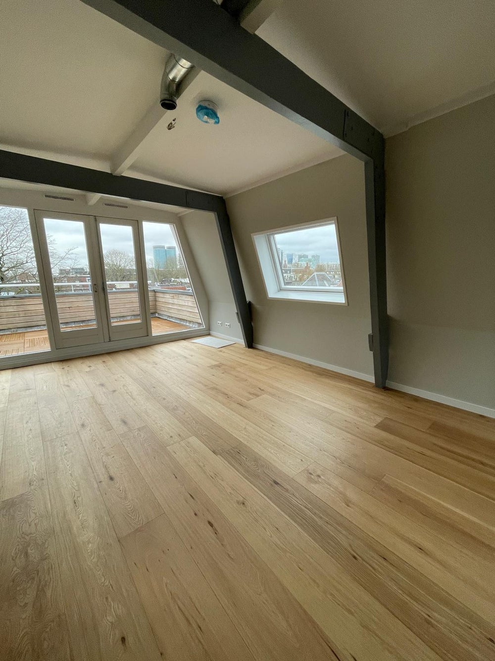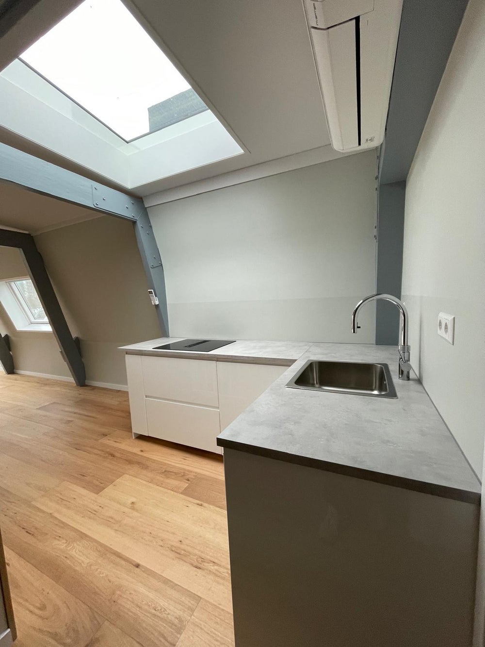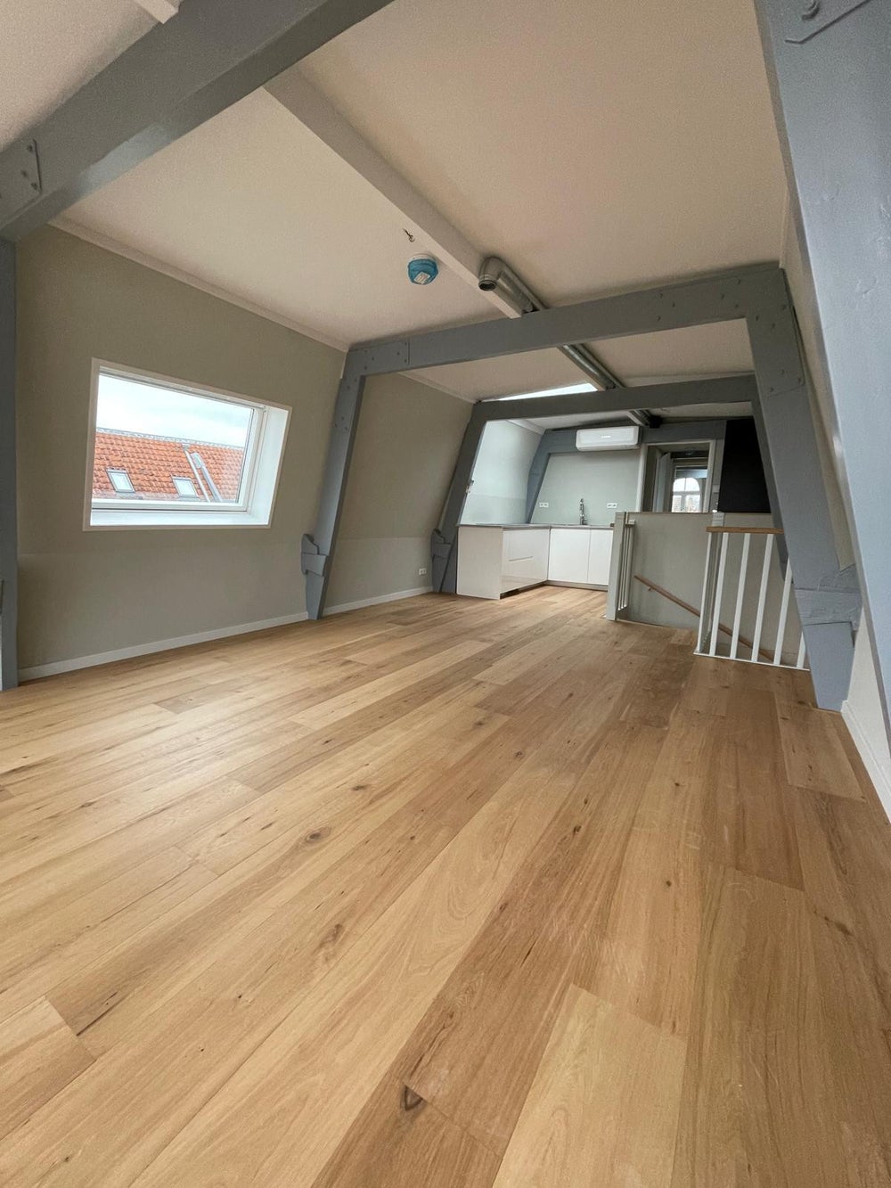 De woonruimte van het appartement is voorzien van een stijlvol lamelparketvloer en Sisal vloerbedekking in de slaapkamer. Dankzij de lichtkoepels in het plafond geniet je hier van een prachtige natuurlijke lichtinval. De karakteristieke balkenstructuur van het pand is zichtbaar door het hele appartement. Het dakterras maakt het helemaal compleet!