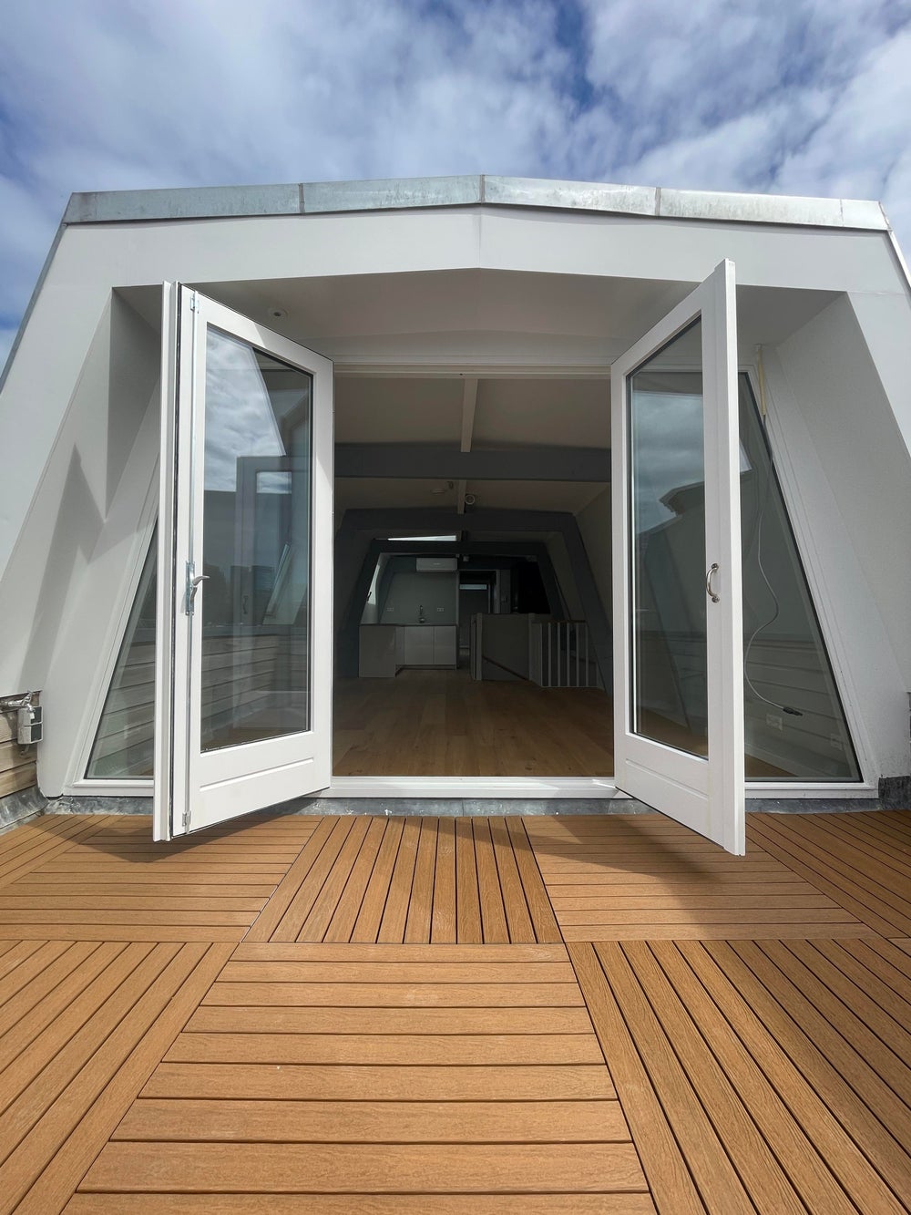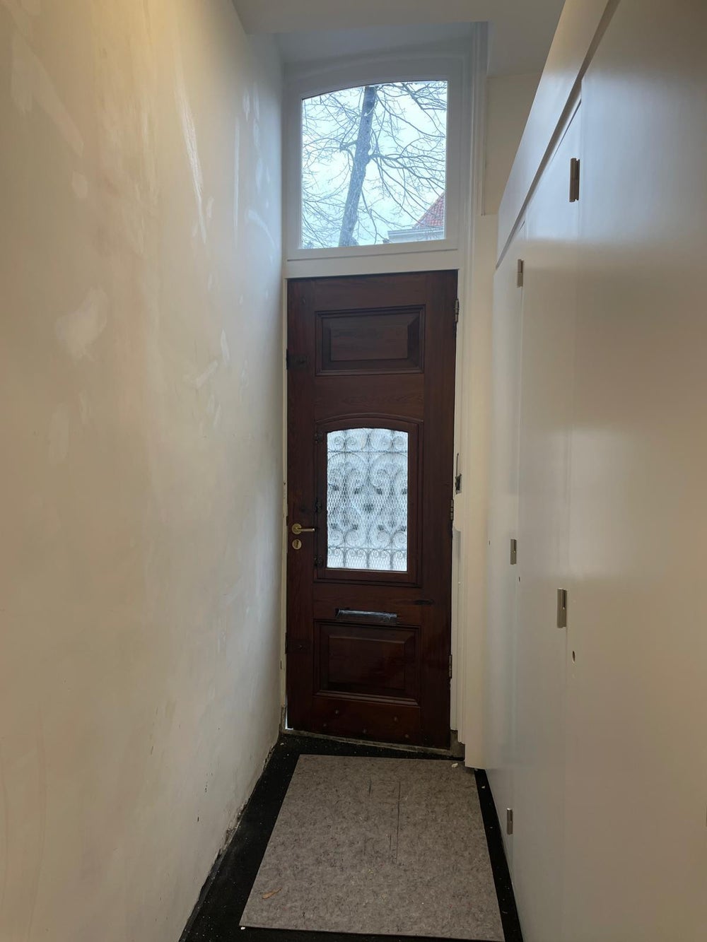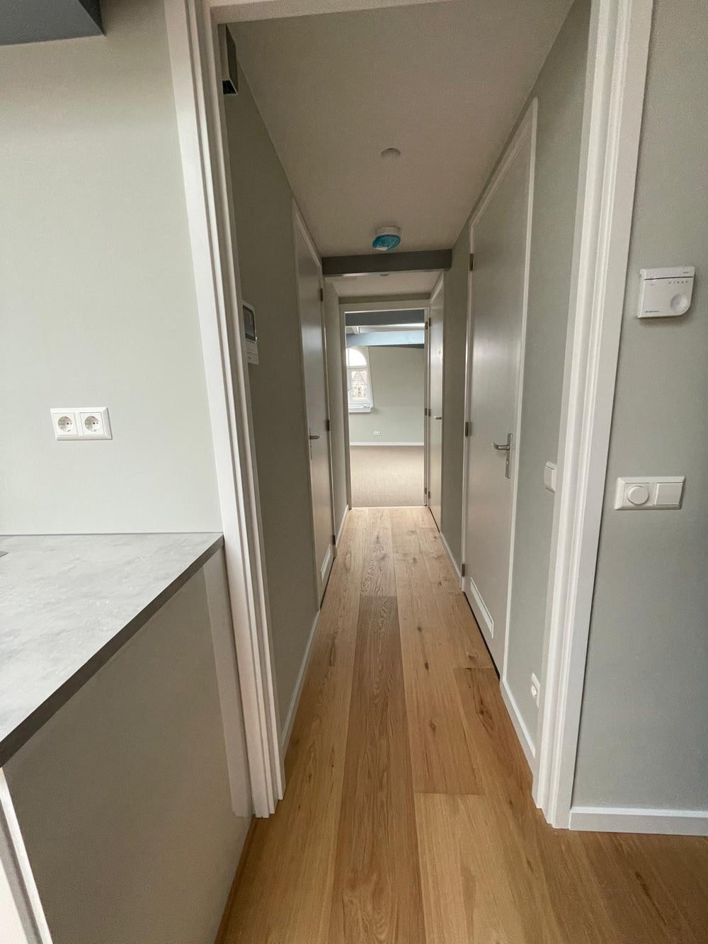 Je betreedt het appartement op de overloop van de tweede etage. Na de voordeur is er ruimschoots voldoende plek voor een kapstok, schoenenrek en additionele opslag voor bijvoorbeeld koffers. Vervolgens stap je via een privé trapopgang de woonkamer in van het appartement op de derde etage.