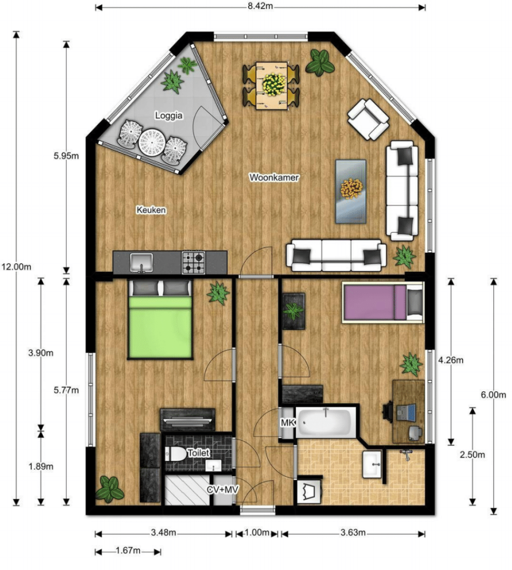 Woonoppervlak ca. 91 m2 (excl. loggia van 9m2 en berging van 9m2)