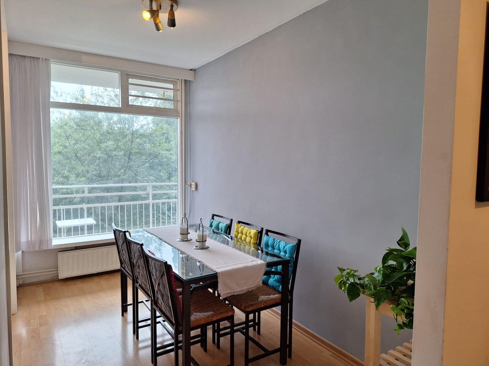 *Woonkamer* – Ruim en licht, met 3-persoonsbank, fauteuil, salontafel, ladekast, tv-meubel en tv. Dubbele glazen wand richting het balkon (west), glazen deur naar balkon.