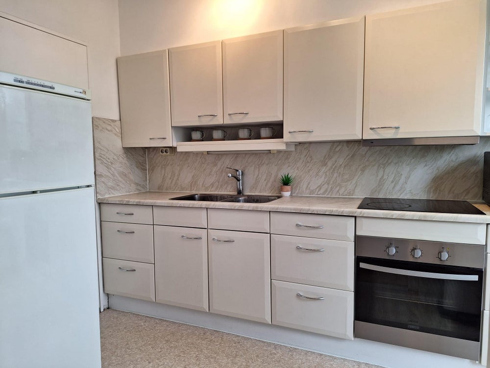 *Keuken* – Semi-open naar eetgedeelte. Koelkast/vriezer, ingebouwde oven, magnetron, elektrisch kookplaat met afzuigkap. Glazen deur naar balkon.