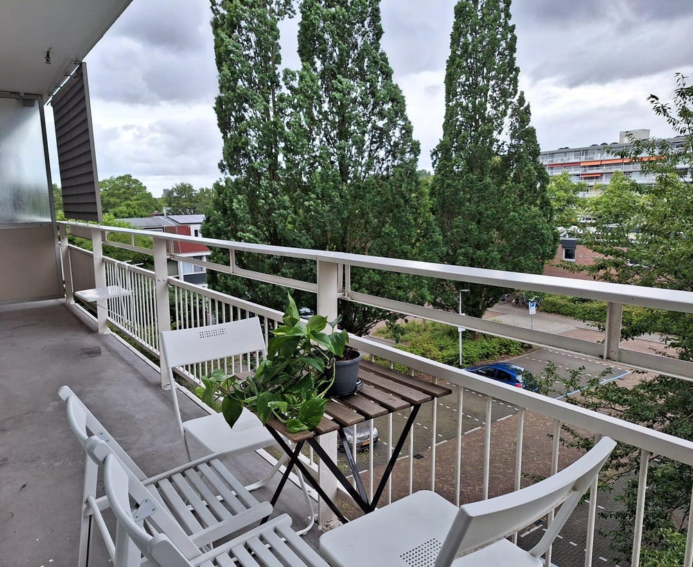 *Balkon* — Westgericht, 7,5 m breed. Tafel en stoelen.