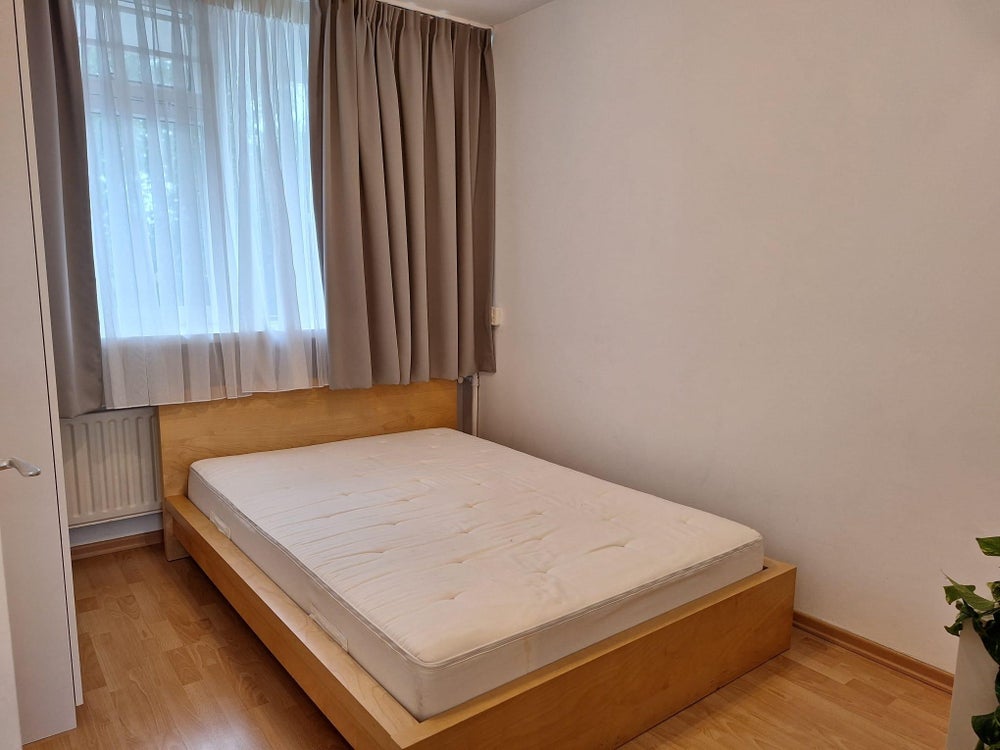 *Slaapkamer 2* – kast, tweepersoonsbed. Ramen op het oosten met privacy- en verduisteringsgordijnen. Geschikt als studeerkamer of kleine slaapkamer.