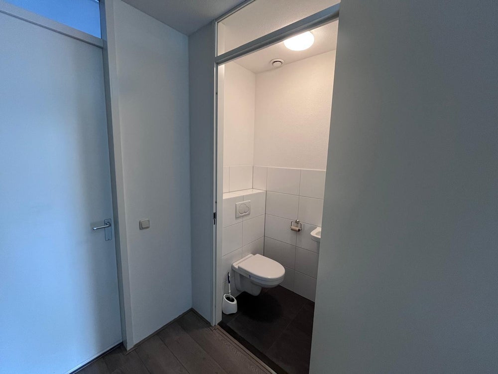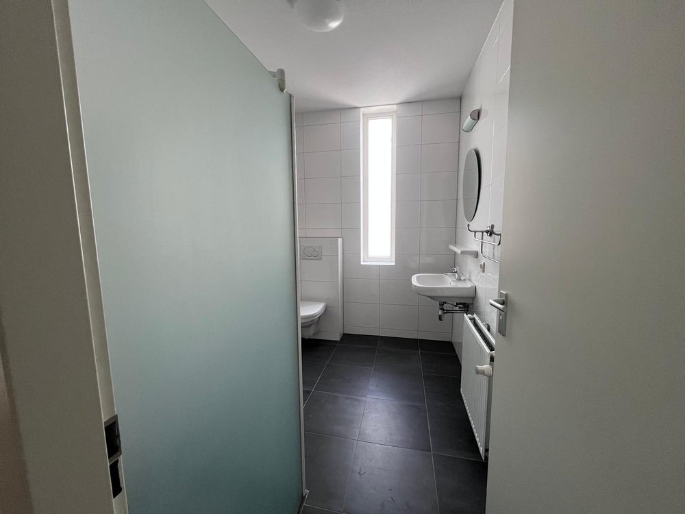 Eerste verdieping: Woonkamer (ca. 34m²), verdeeld in een voorkamer en achterkamer met aan de voorzijde een fraai en open uitzicht en een dakterras op zuid-westen. Slaapkamer 1 (ca. 10m²), met toegang tot het dakterras en badkamer. Geheel betegelde moderne badkamer (ca. 7,3m²), voorzien van vaste wastafel, inloopdouche, ligbad, wandcloset, designradiator en daglichttoetreding.
